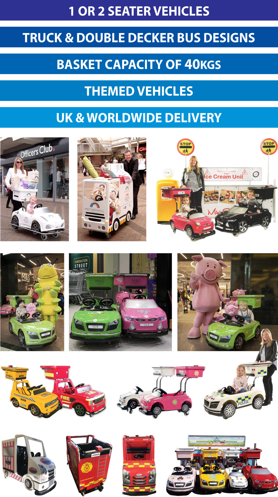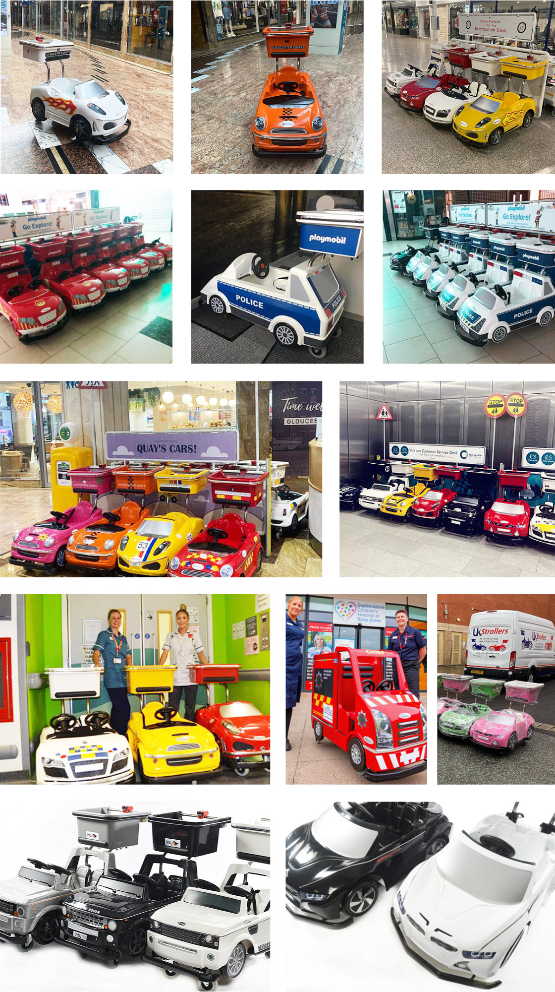 UK Strollers Mini Shoppers are practical in use. Stylish and a hit with children and Centre management alike. They are economical in storage and bring benefits to retailers from